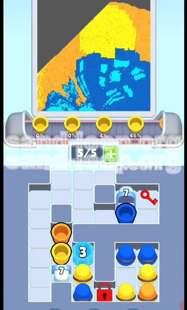 - Belt Management: If the cups you tapped are Yellow/Orange and the nozzle is currently pouring Blue, do not match them immediately. Let them ride the belt (loop) to keep slots open, or sacrifice them into the "wrong" color bin if necessary to clear space. The priority is getting the key, not saving the paint.