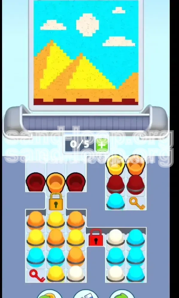 The visual goal is to paint a pixel-art scene of the Egyptian Pyramids against a clear sky. However, the challenge lies in the "Key Economy." Essential resources—specifically the sand needed for the sky and clouds—are locked behind barriers that can only be opened by completing the pyramid sections first. If you mismanage your sand supply early in the level, you will find yourself unable to finish the upper sections of the painting.