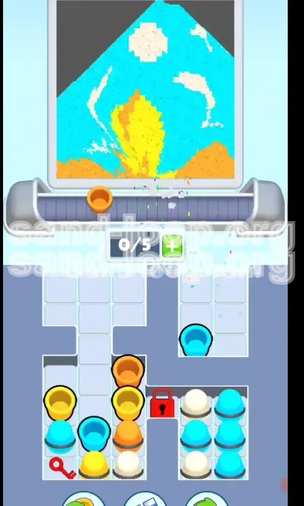 - Gold Key: Unlocks the central barrier, giving you access to the main reservoir of Orange and Yellow sand.