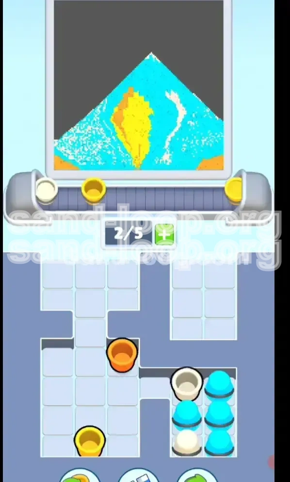 The final 40% of the level involves painting the sky. The challenge here is "Gap Management." The pyramids are separated by gaps of blue sky. You must learn to stop the flow of sand (create a gap on the conveyor belt) exactly when the nozzle transitions from the top of one pyramid to the empty space beside it. Failure to do this will result in yellow "sky" or orange "clouds," ruining the score.