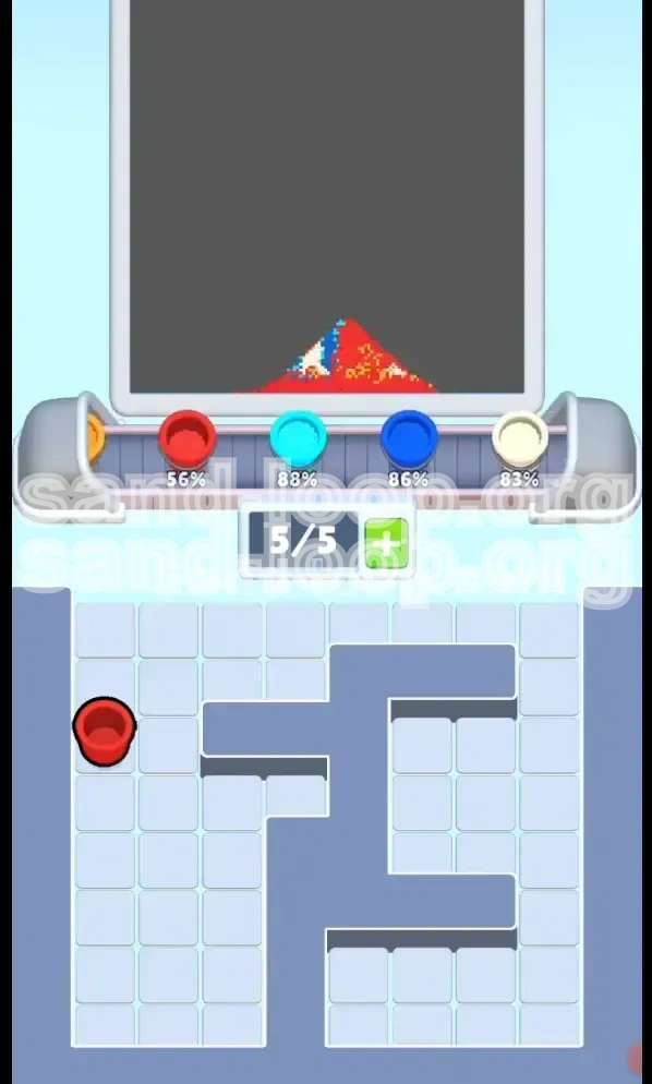 Sand Loop Level 85, titled "The Mountain Sunrise," is a deceptive logic puzzle that prioritizes precision over speed. While the timer ticks, the real threat to your progress is a strict 5-slot tray limit combined with a heavily locked board state. The visual composition—a pixel art representation of a snow-capped mountain against a gradient sunset—masks a complex dependency chain. You cannot simply paint from top to bottom; you must unlock the board in a specific sequence to access the necessary color cups.