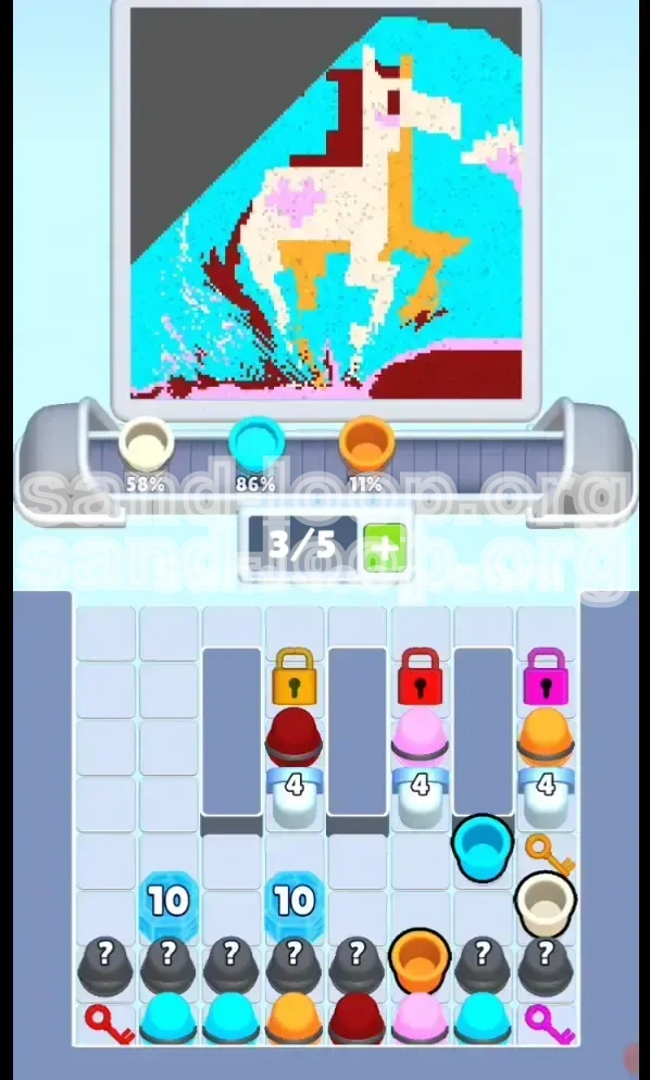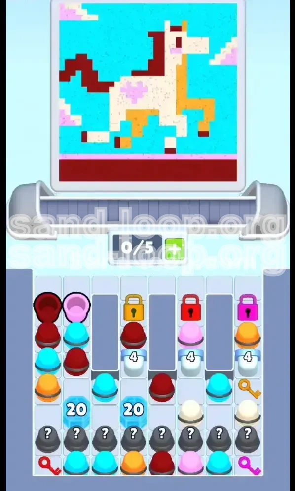 Welcome to Level 86, one of Sand Loop’s most distinct hybrid stages. This level combines the artistic satisfaction of Pixel Art creation with the logistical pressure of a limited inventory management system. The image you are tasked with recreating is a vibrant "Galloping Pony" (often interpreted as a Unicorn due to the single pink horn pixel) set against a wide, cyan sky.